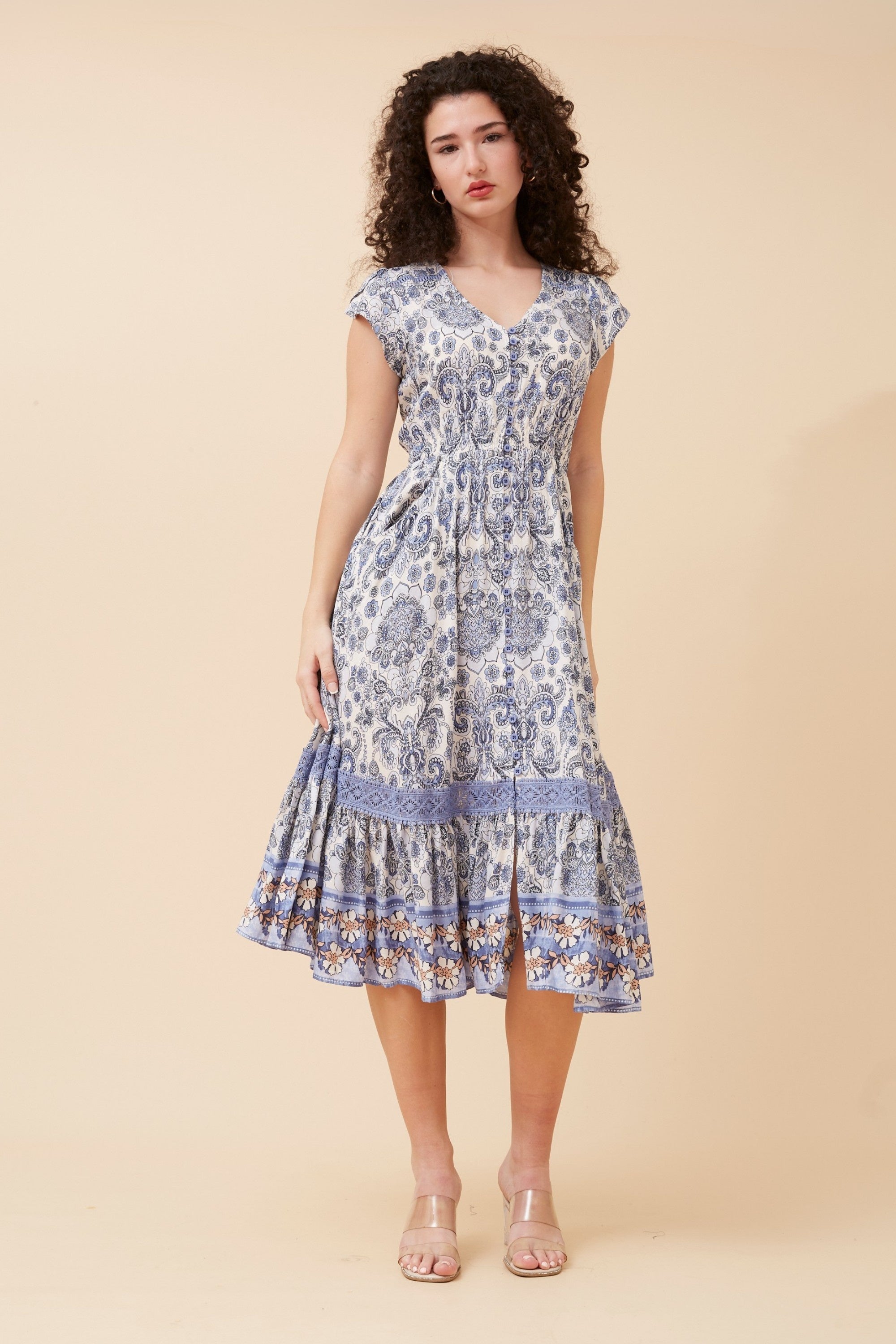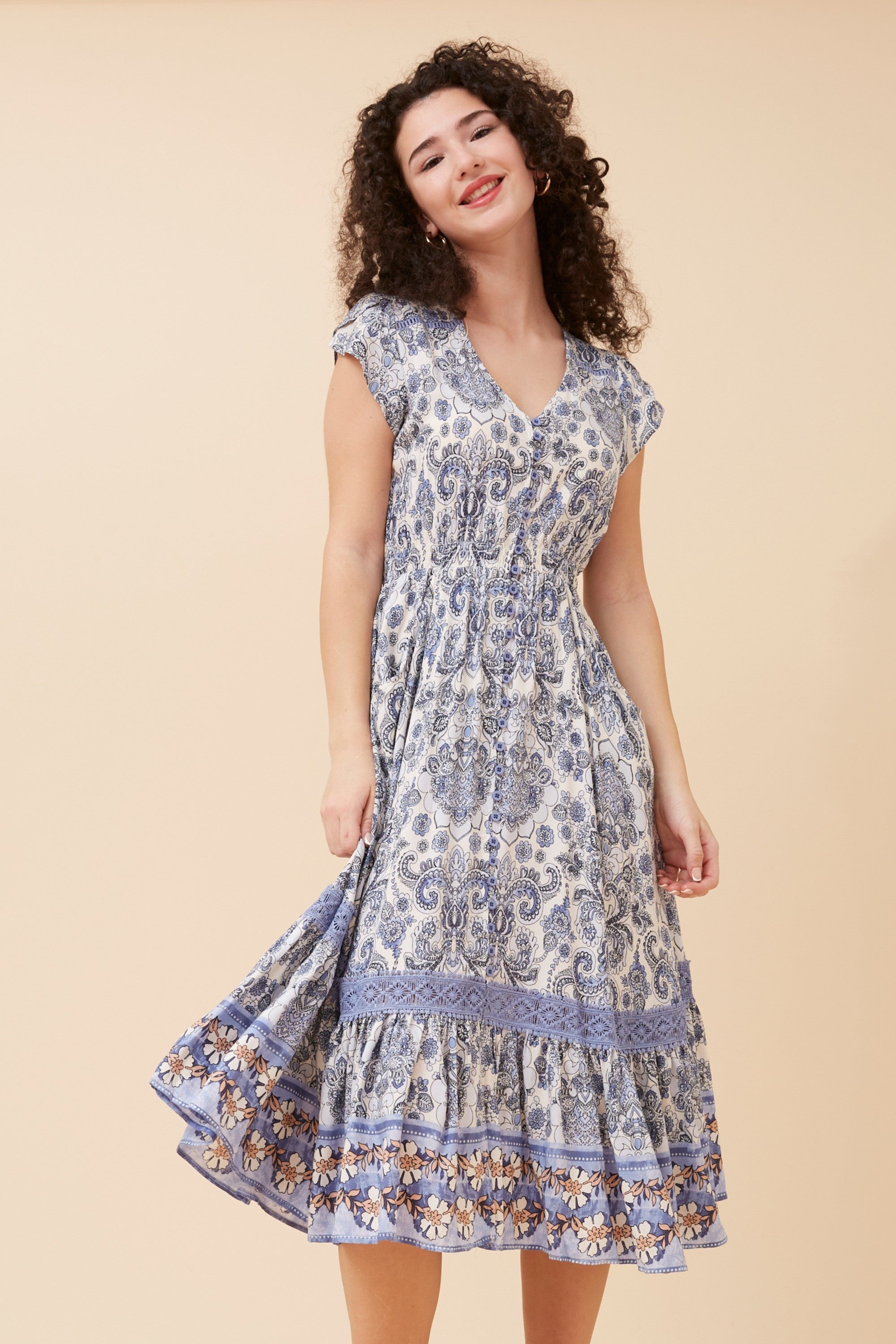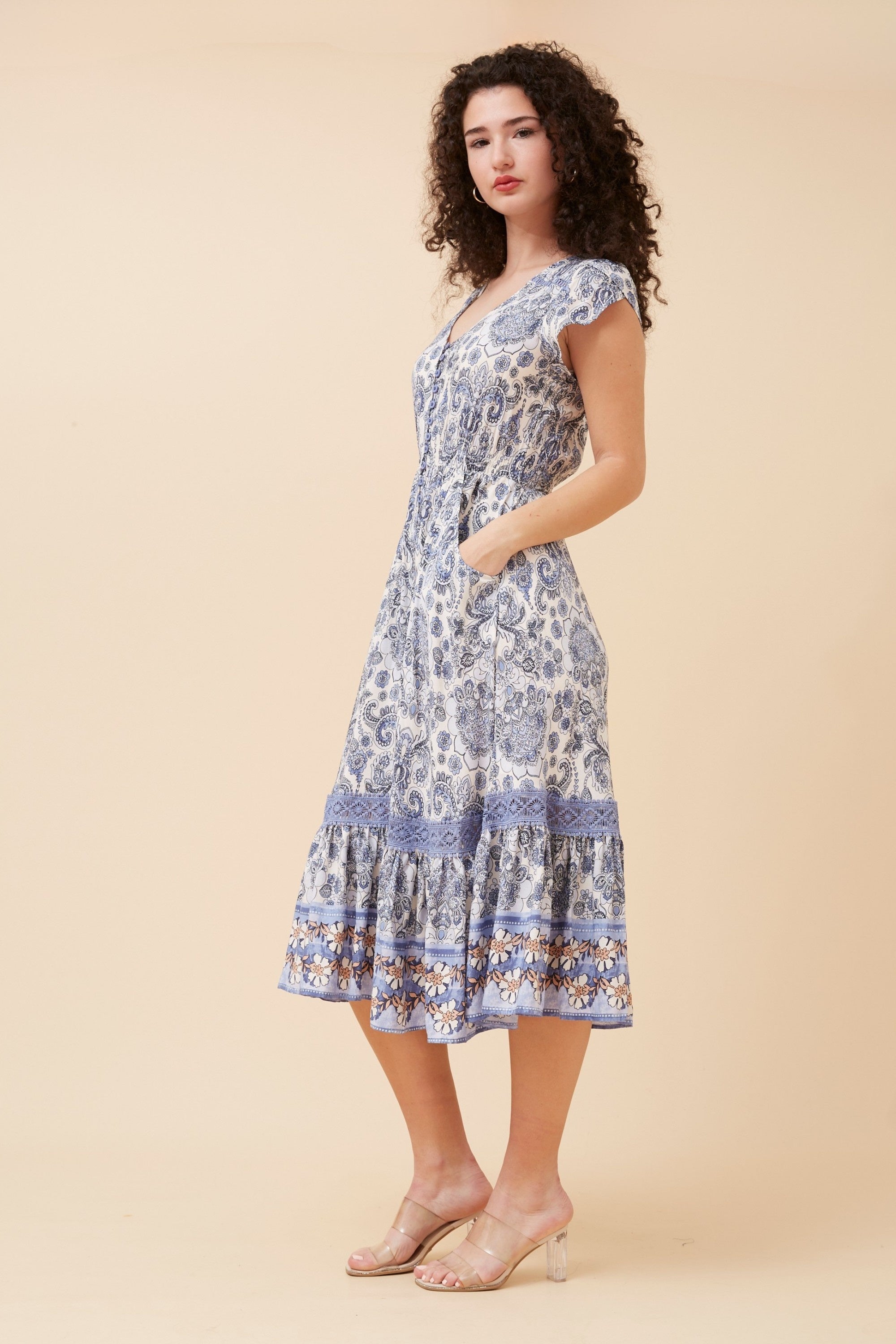 The Capri Dress is a holiday essential that’s equal parts relaxed and refined. With its flattering V neckline, soft shirred waist, and delicate lace trim details, it’s the kind of piece that makes summer styling feel effortless. The border print adds a unique touch, while the lace hem panel gives it a feminine finish that feels special without trying too hard.