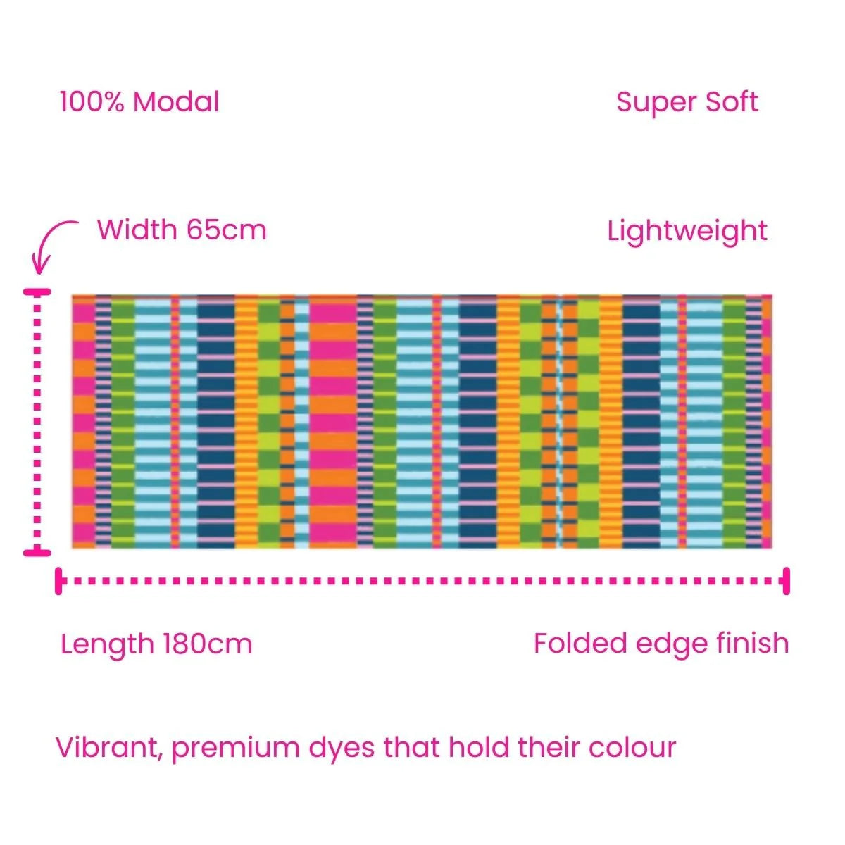 Inject instant energy into your wardrobe with the Feelin' Fine Long Scarf - a vibrant celebration of bold colour and playful design. With its lively stripes in joyful pinks, oranges, blues, and greens, this scarf brings a sense of fun and flair to any look, whether you're dressing up or keeping it casual.