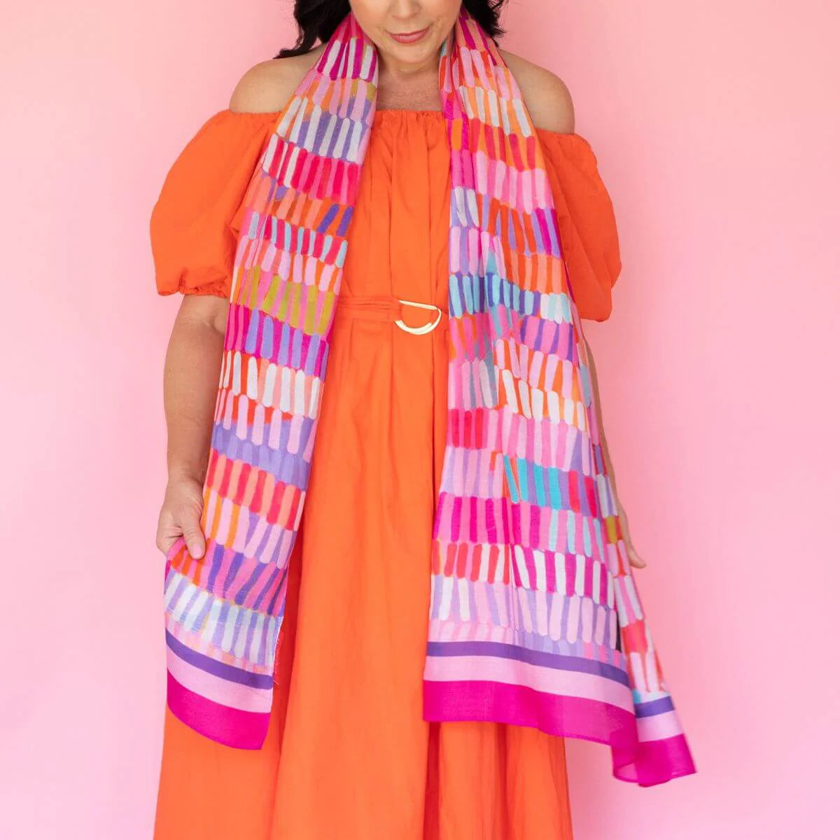 Some colours just make you feel good. The Raspberry Gelato Long Scarf is a dreamy swirl of luscious pinks, creamy whites, and berry-rich tones — like your favourite summer scoop, but one you get to wear. It's soft, it's sweet, and it's utterly irresistible.