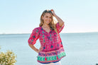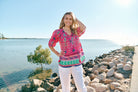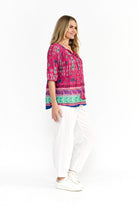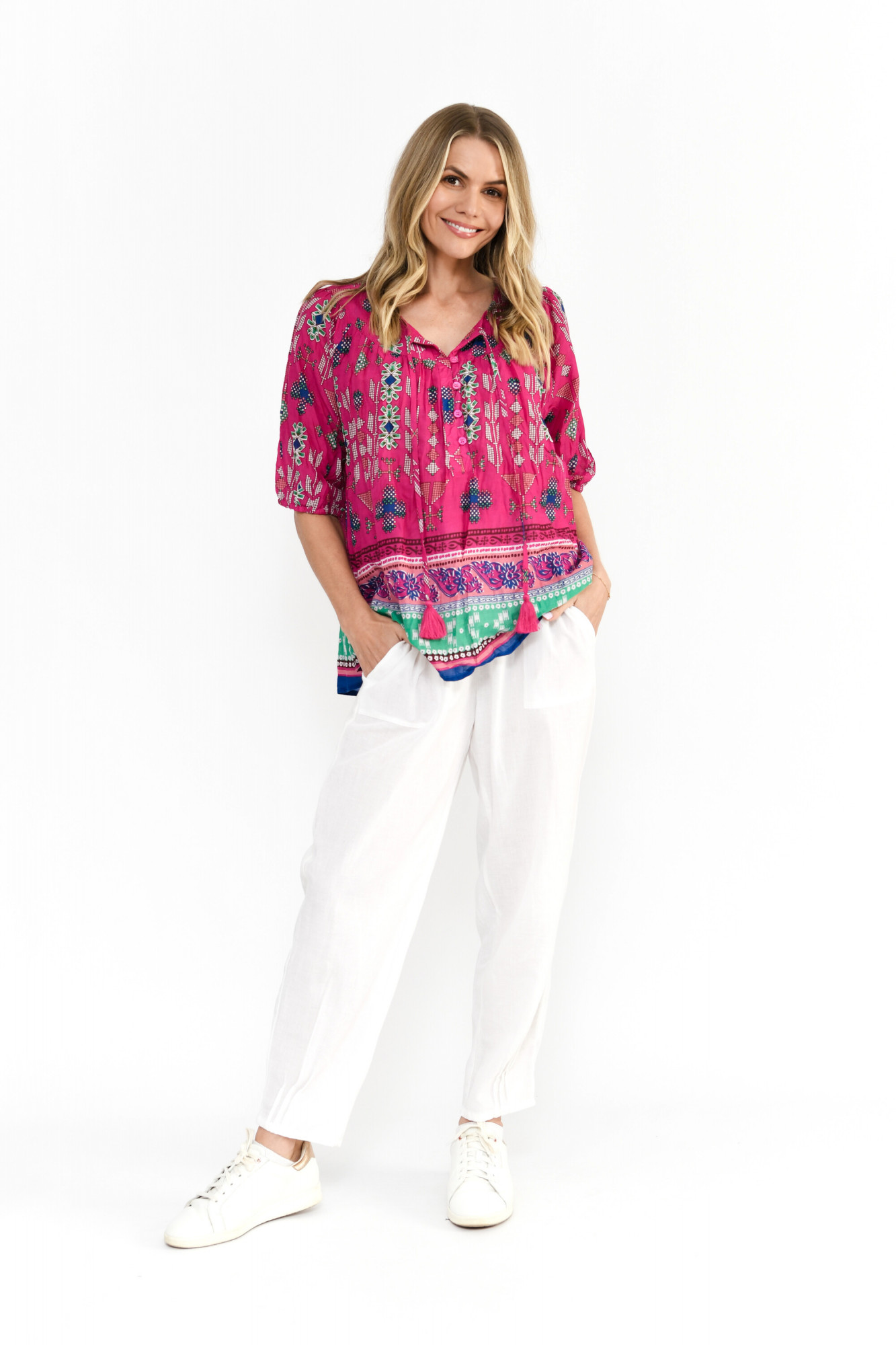 Bring a splash of colour and carefree charm to your wardrobe with the Tessa Top. Crafted from 100% breathable cotton, it’s light, easy to wear and made for days when comfort matters just as much as style. The relaxed fit drapes beautifully, while the V neckline with playful tassel details adds a touch of bohemian flair. Finished with elegant ¾ sleeves, this is a versatile piece that feels as good as it looks.